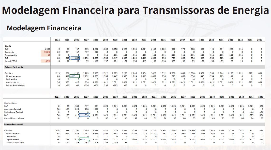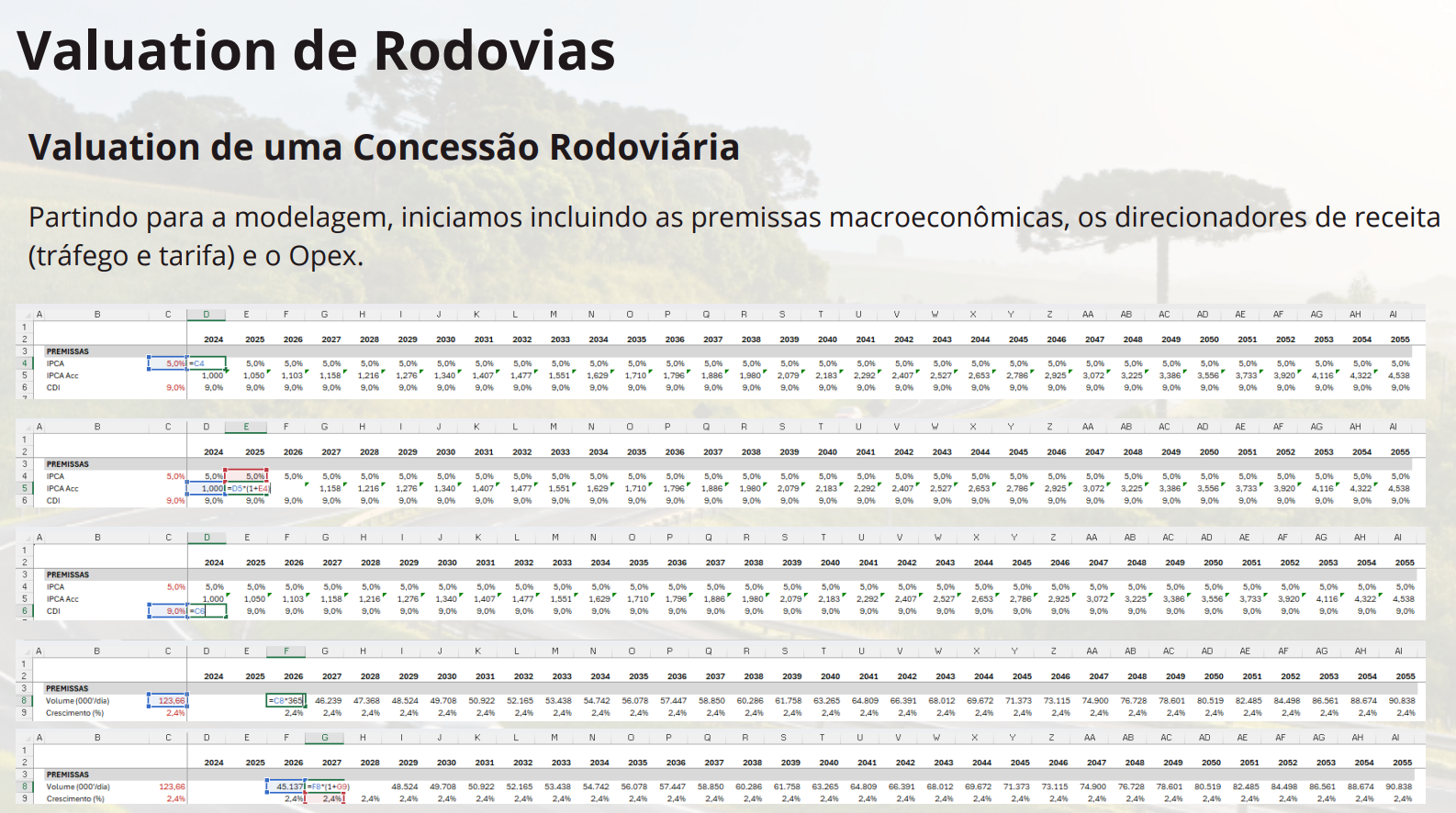 - Projeções Financeiras de Longo Prazo: Domine técnicas para realizar projeções financeiras com base em parâmetros regulatórios, contratos de concessão, receitas garantidas, entre outros fatores típicos de empresas de infraestrutura.